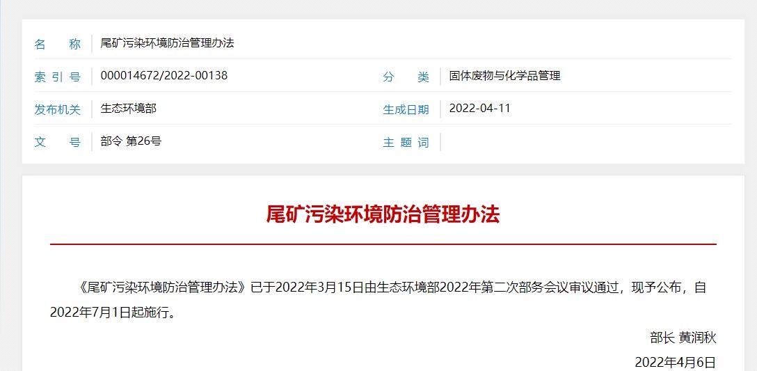 省級生態(tài)環(huán)境主管部門負責確定本行政區(qū)域尾礦庫分類分級環(huán)境監(jiān)督管理清單,并加強監(jiān)督管理。